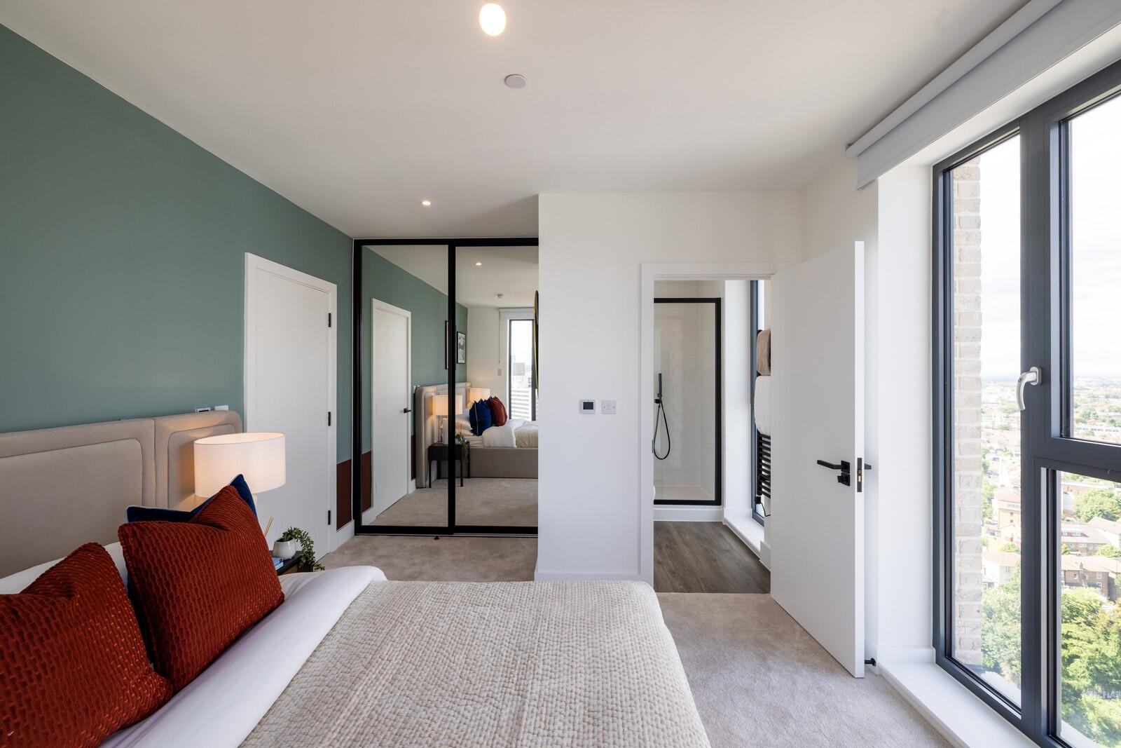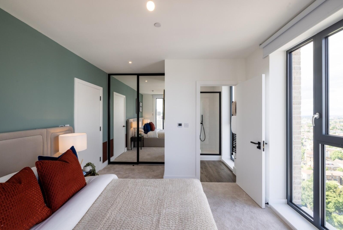 A well-appointed bedroom with a calm and soothing palette. It features an elegant bed dressed in soft, neutral linens, positioned opposite built-in mirrored wardrobes that reflect light and add to the room’s spacious feel. Large windows allow ample daylight, while the tasteful decoration provides a cosy yet modern atmosphere.