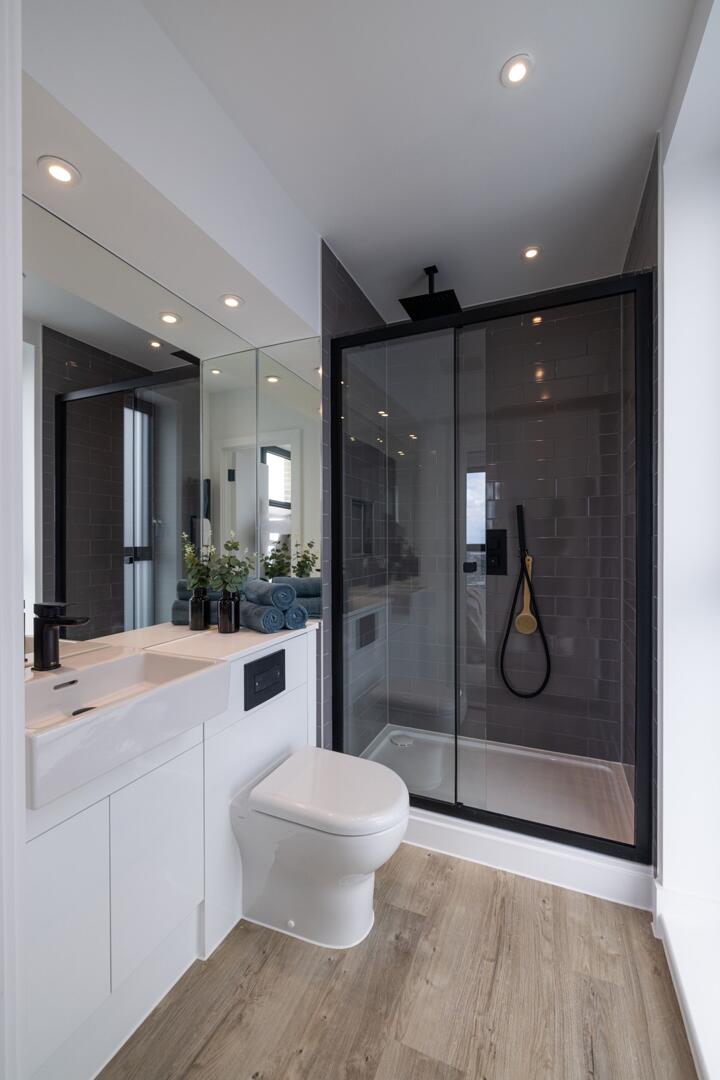 This bathroom is finished with a sleek, modern style focused on clean lines and practical design. It includes a spacious walk-in shower enclosed with glass panels and a neutral palette of whites and blacks. A wide basin with a minimalist tap and a large mirror above enhances the light and sense of space within this compact yet elegant room.