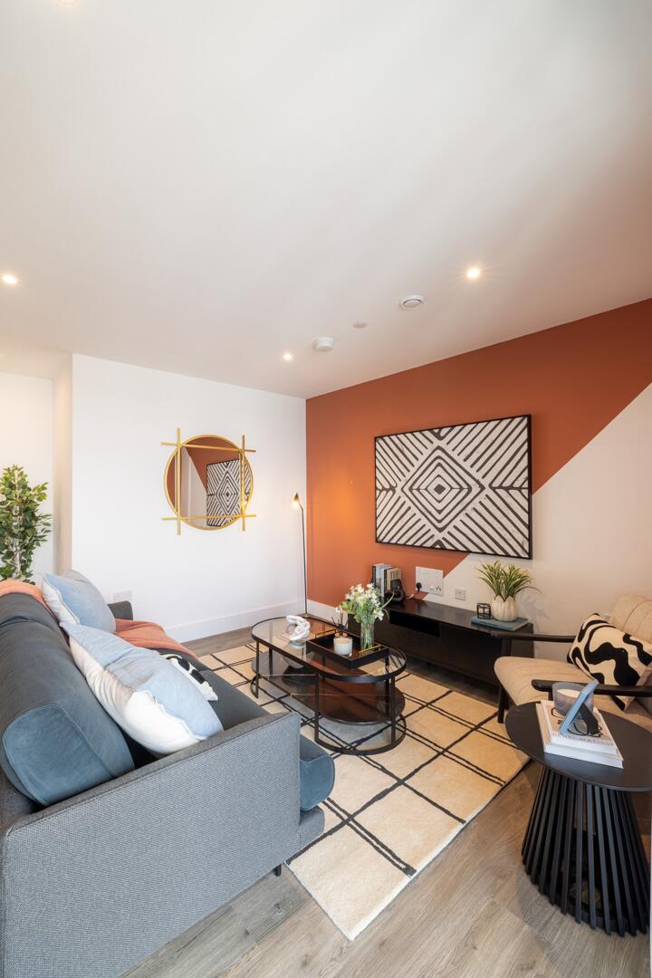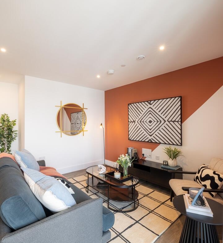 This open-plan living area blends modern comfort with style, featuring a cosy sofa and a distinctive circular mirror with a classic frame that adds a touch of elegance. The kitchen area is sleek and practical with light cabinetry and a black mixer tap, seamlessly integrated into the living space. The room is gently lit with recessed ceiling lights and offers a welcoming atmosphere.