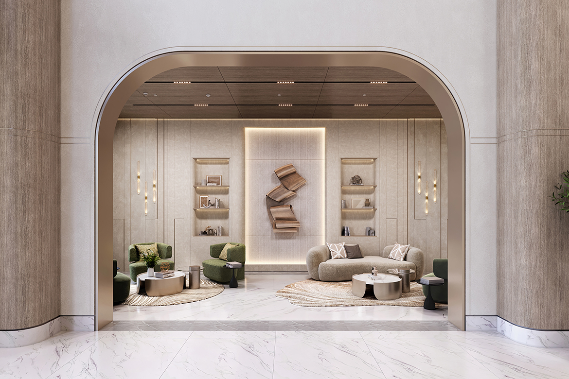 Sunlight pours into the double-height lobby, casting a warm glow on marble textures and refined finishes. In select buildings, private panoramic elevators offer residents a discreet and seamless journey home, with views as iconic as Milan itself.