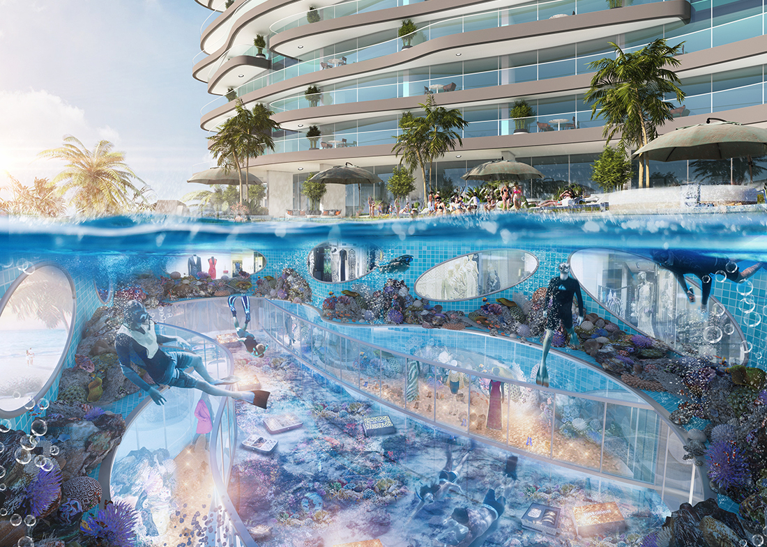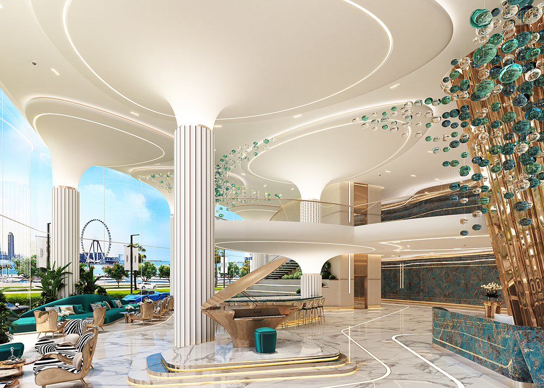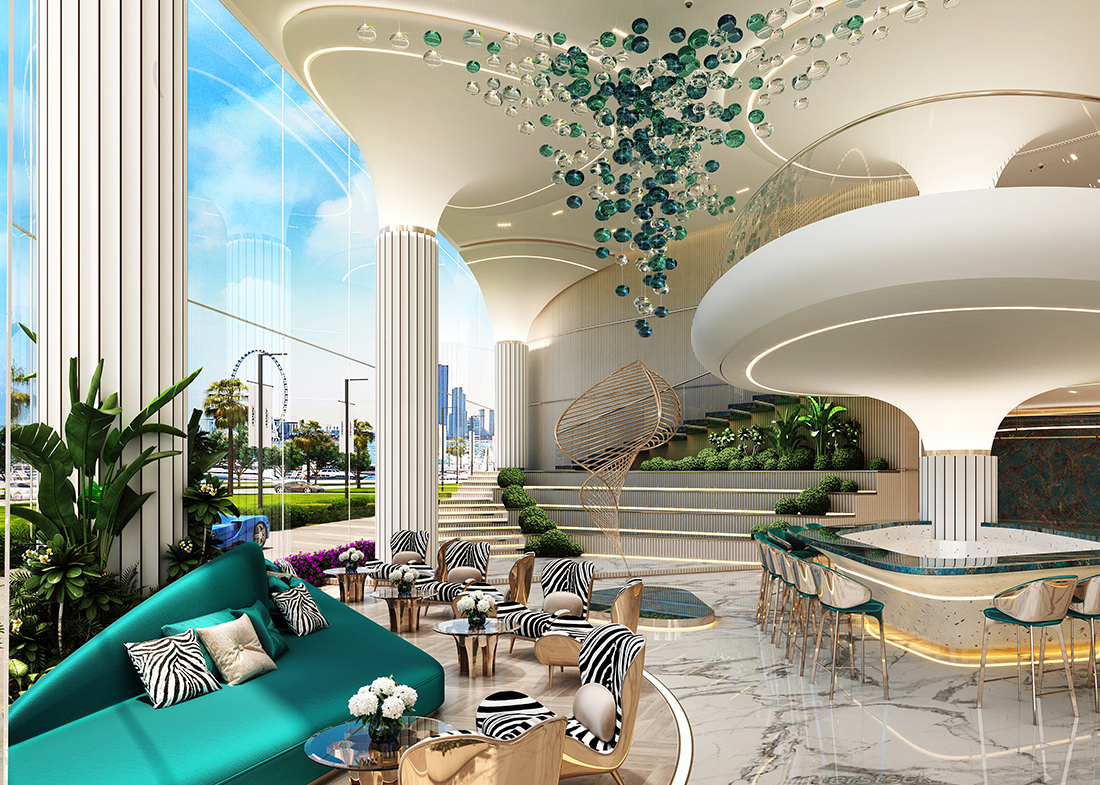 Rising 42 storeys high, the twin towers feature sleek, wave-like architecture and nautical-themed interiors by the renowned fashion house Cavalli, blending haute couture elegance with waterfront serenity
