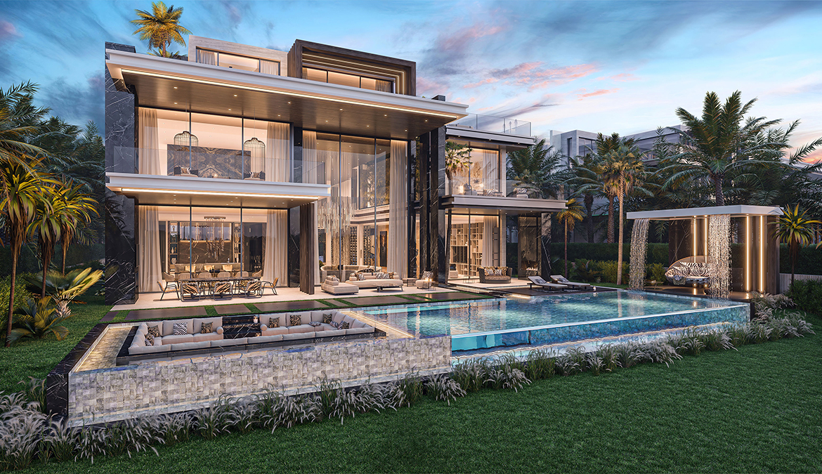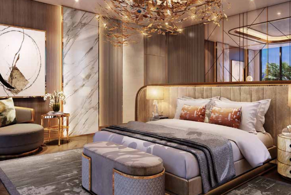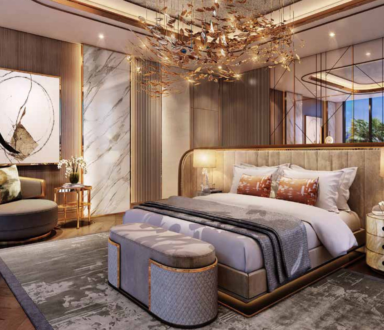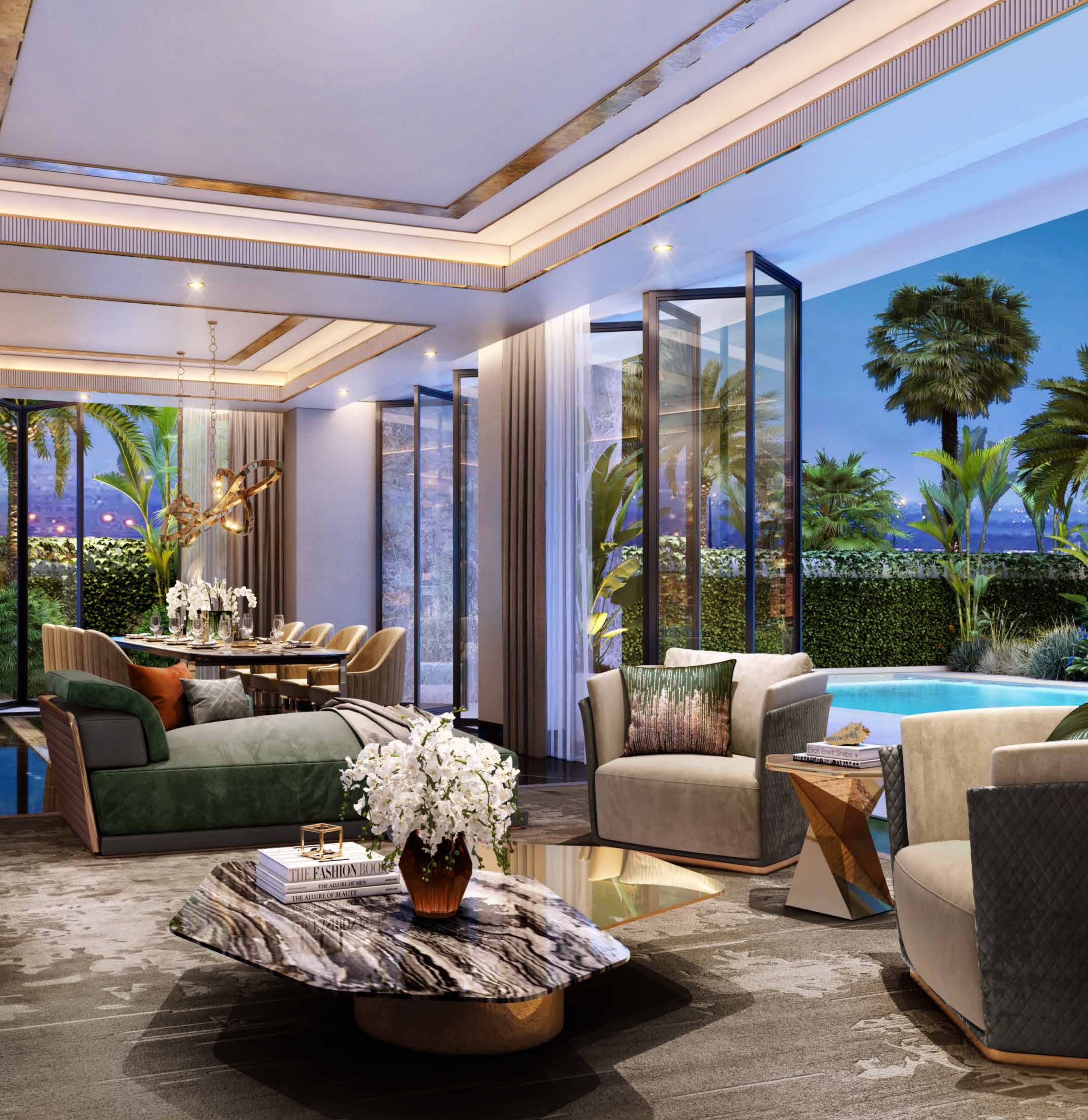 Interiors are lined with black and grey marble to accentuate the air of Italian luxury. Careful use of green and gold accent colours, indirect lighting, and wood panels elevate your living experience to something truly sublime
