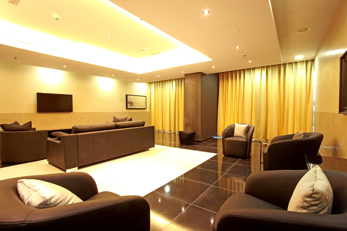 Relaxing Spaces: A quiet lounge area with comfortable seating and large television screens, away from the bustle of the city.