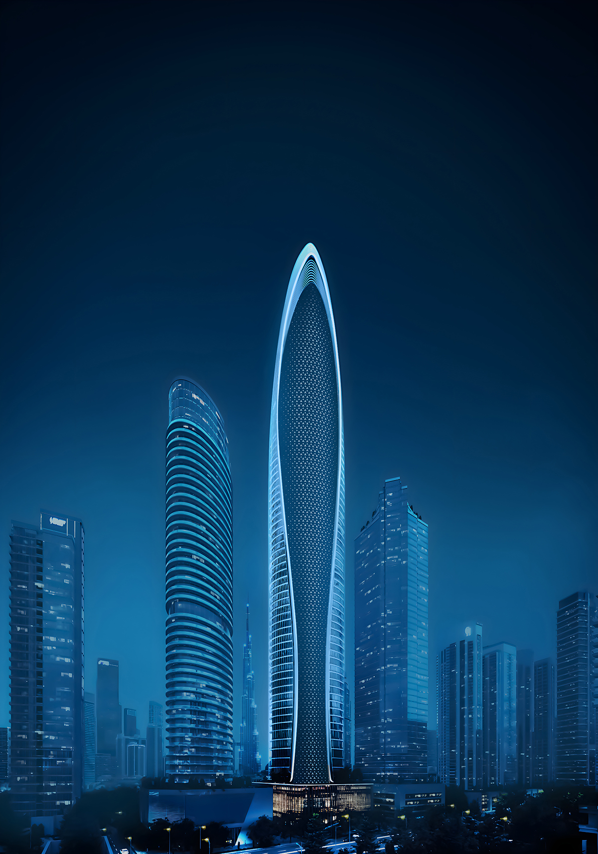 Defined as an epochal architectural symbol, the hyper-tower’s supremacy is brought to life by the amalgamation of multiple design languages. The use of intricate strokes, mingled with the candescent pattern of the Mercedes-Benz three-pointed star, manifests revolutionary architecture and craftsmanship.
