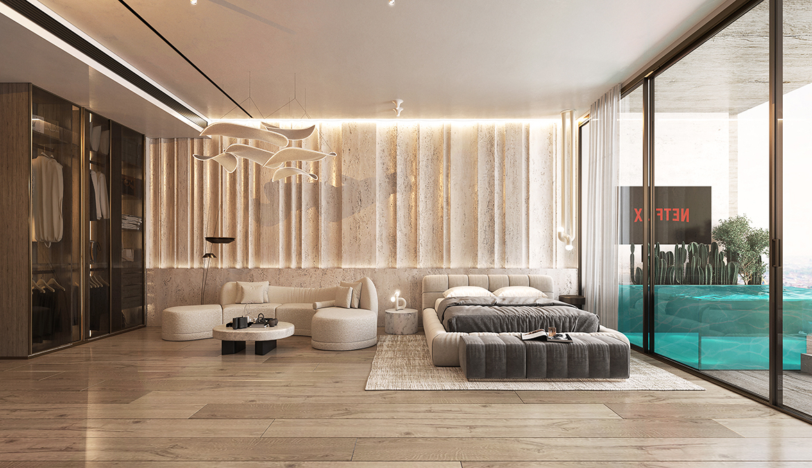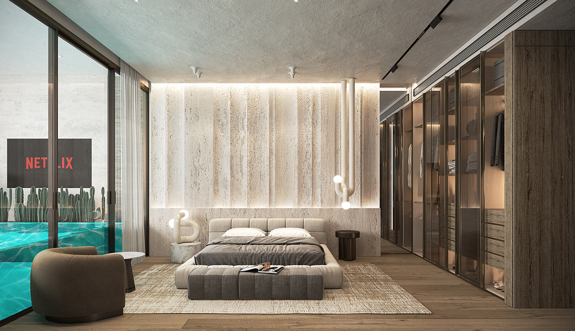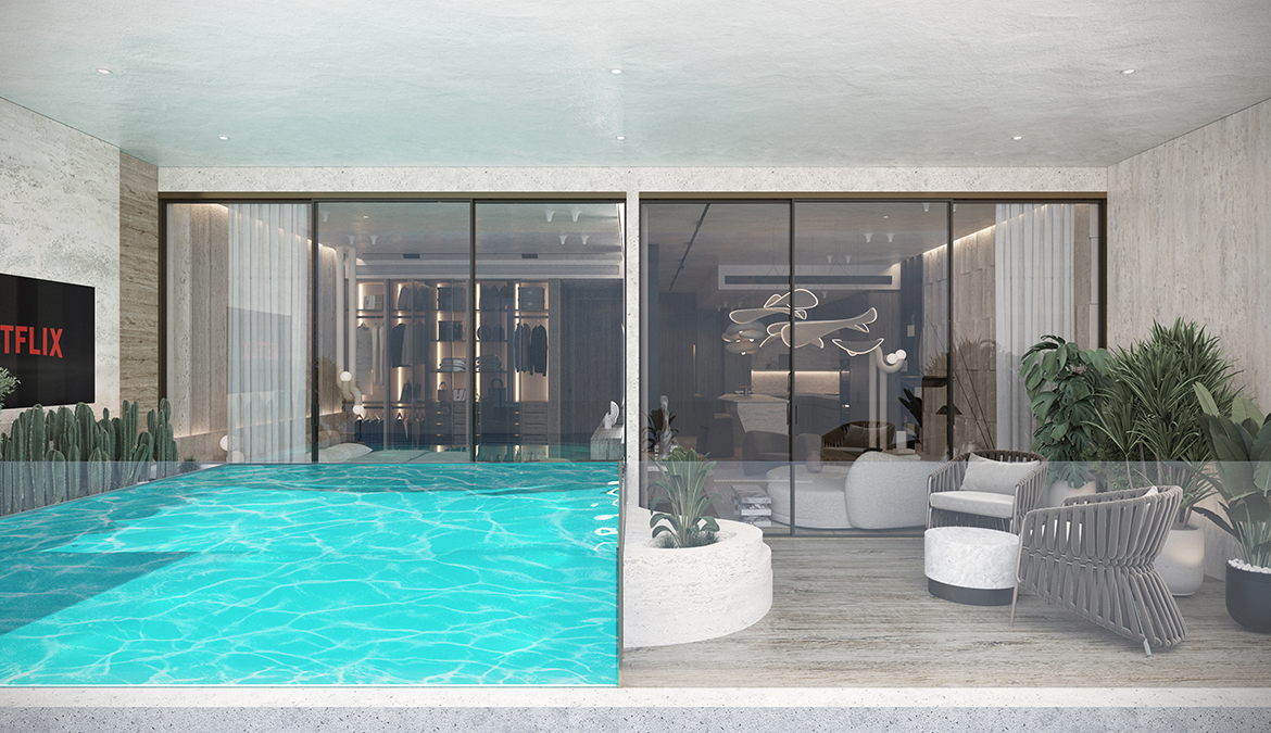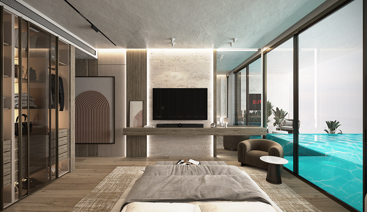 Step into unparalleled luxury with our main bedroom, adorned with premium Italian ceramics. Every detail has been meticulously curated to provide an ambience of sophistication and comfort, ensuring a serene and restful environment. The master bedroom opens to a private balcony featuring an exclusive swimming pool, enhancing your living experience. Bask in the epitome of opulence as you enjoy a seamless blend of indoor and outdoor living, all within your private sanctuary