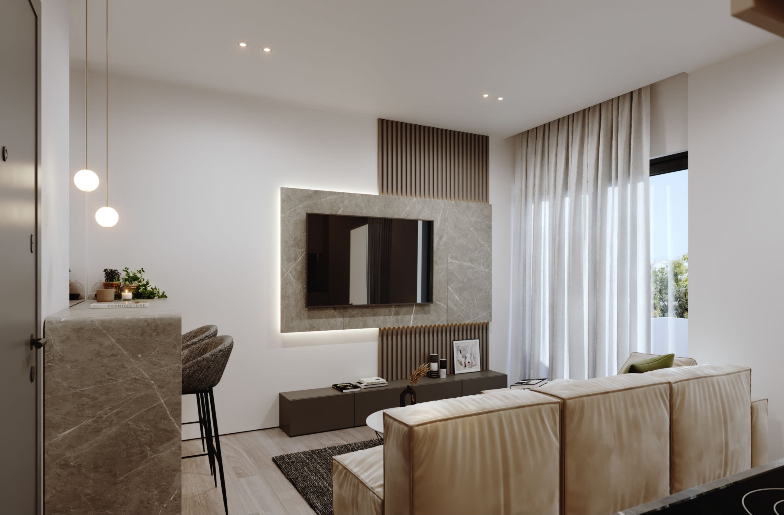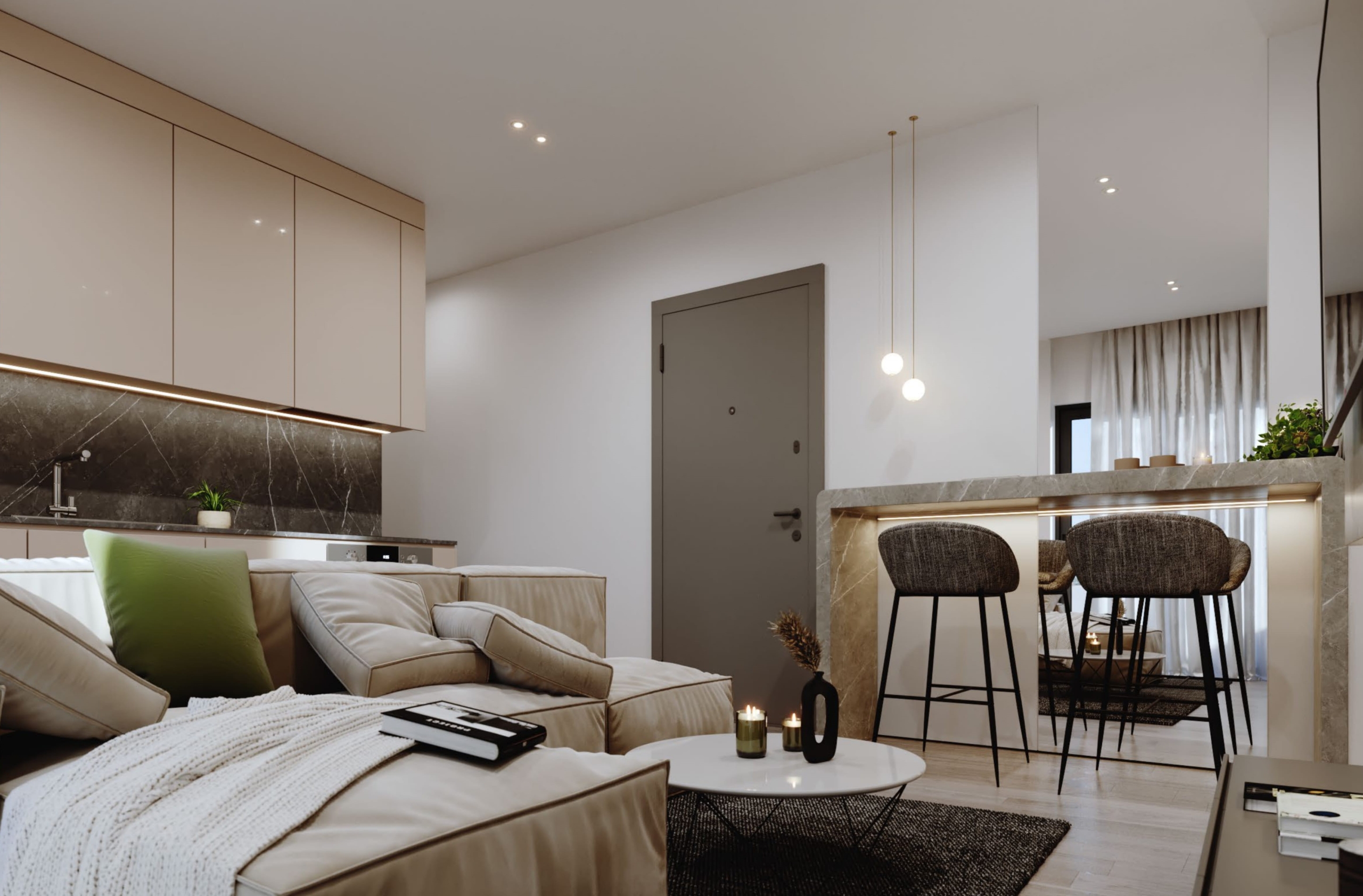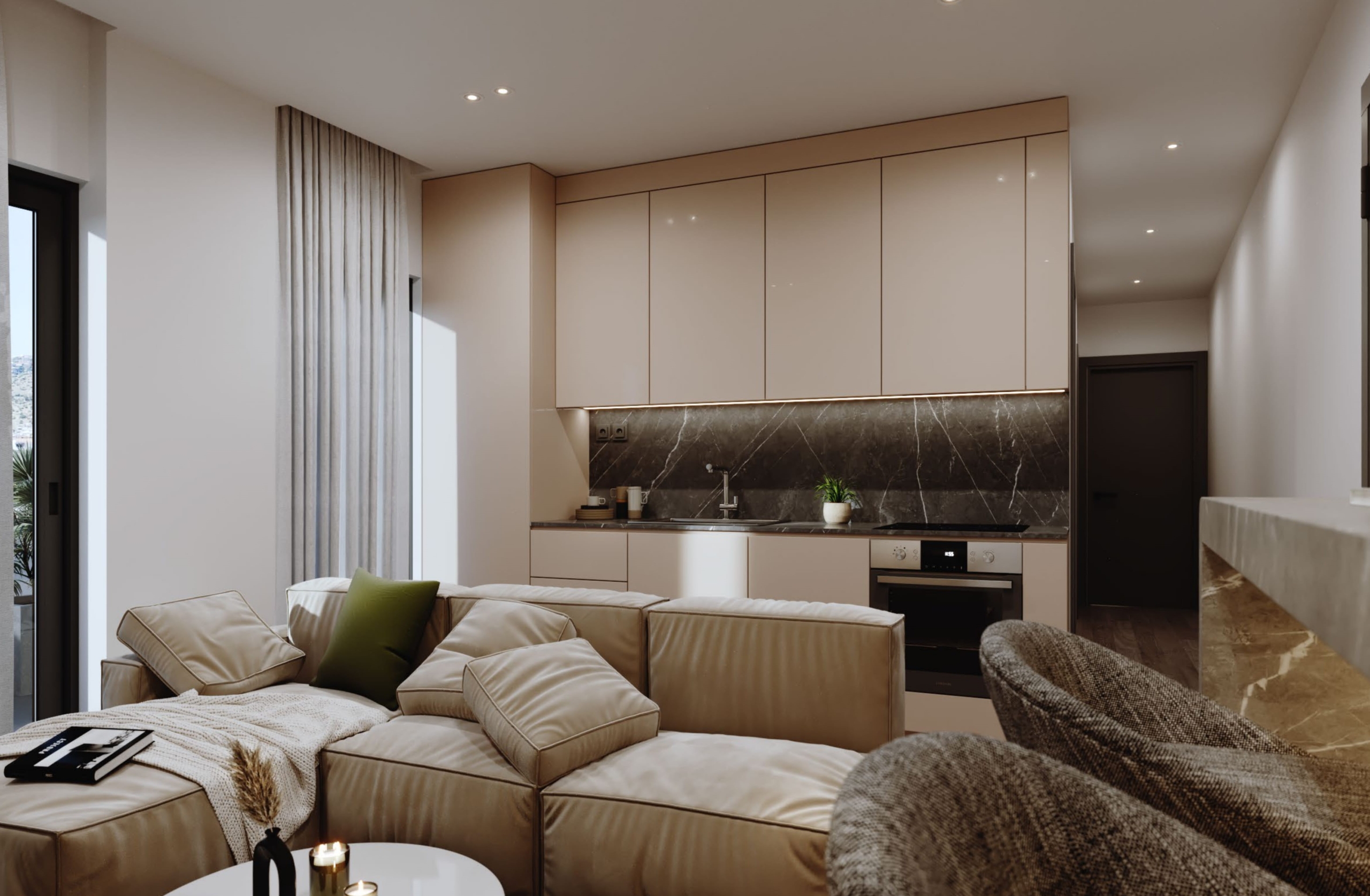 Sophisticated Interior Design: Apartments feature a warm, earthy atmosphere with beige and greige-toned tiles, handleless Gola-style cabinetry, and two-toned kitchens blending walnut wood finishes with soft beige.