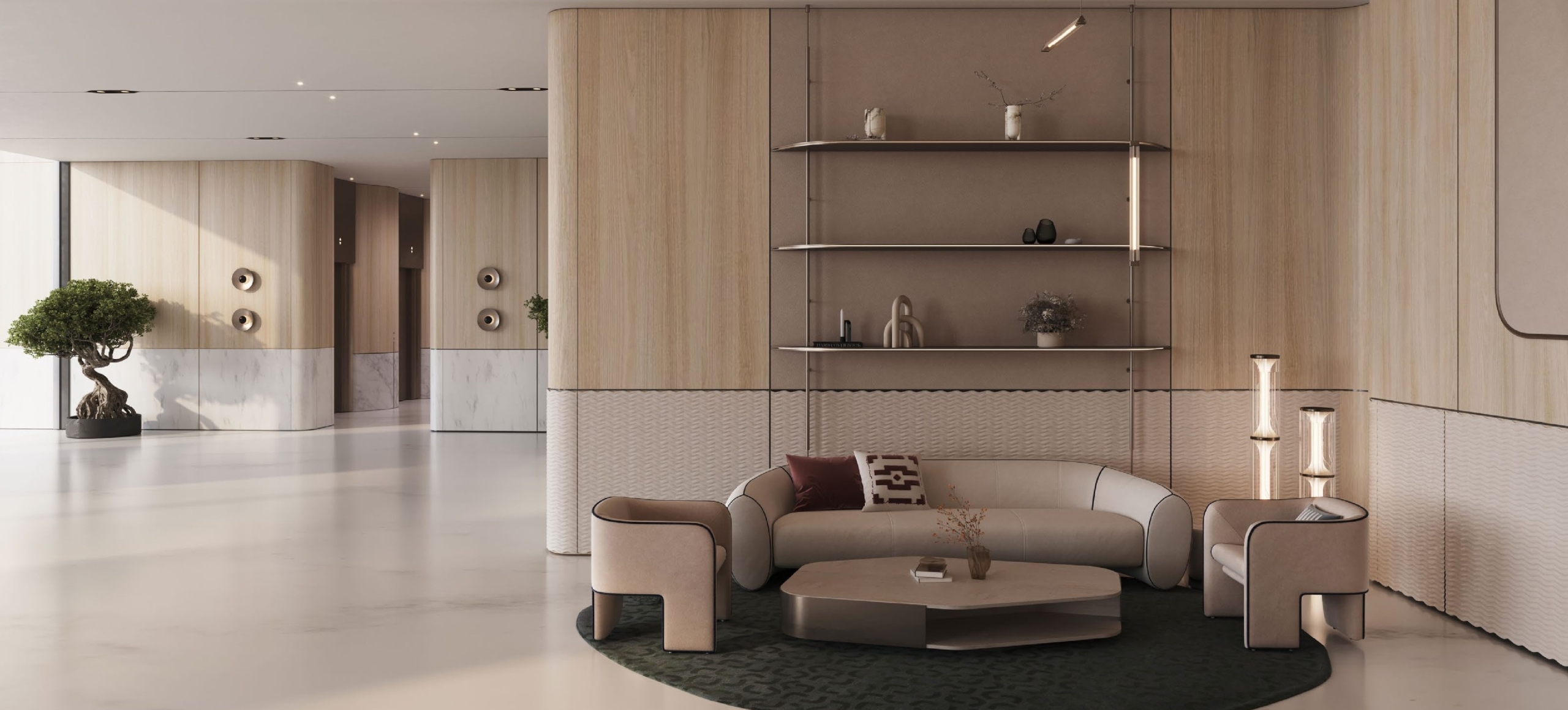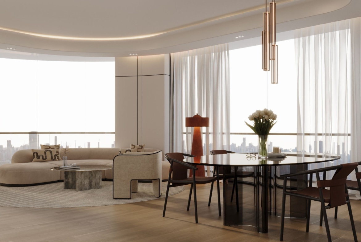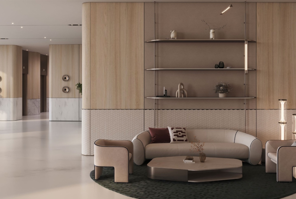 • Masterfully curated interiors featuring exquisite materials like marble, natural wood, and Fluted Travertine.