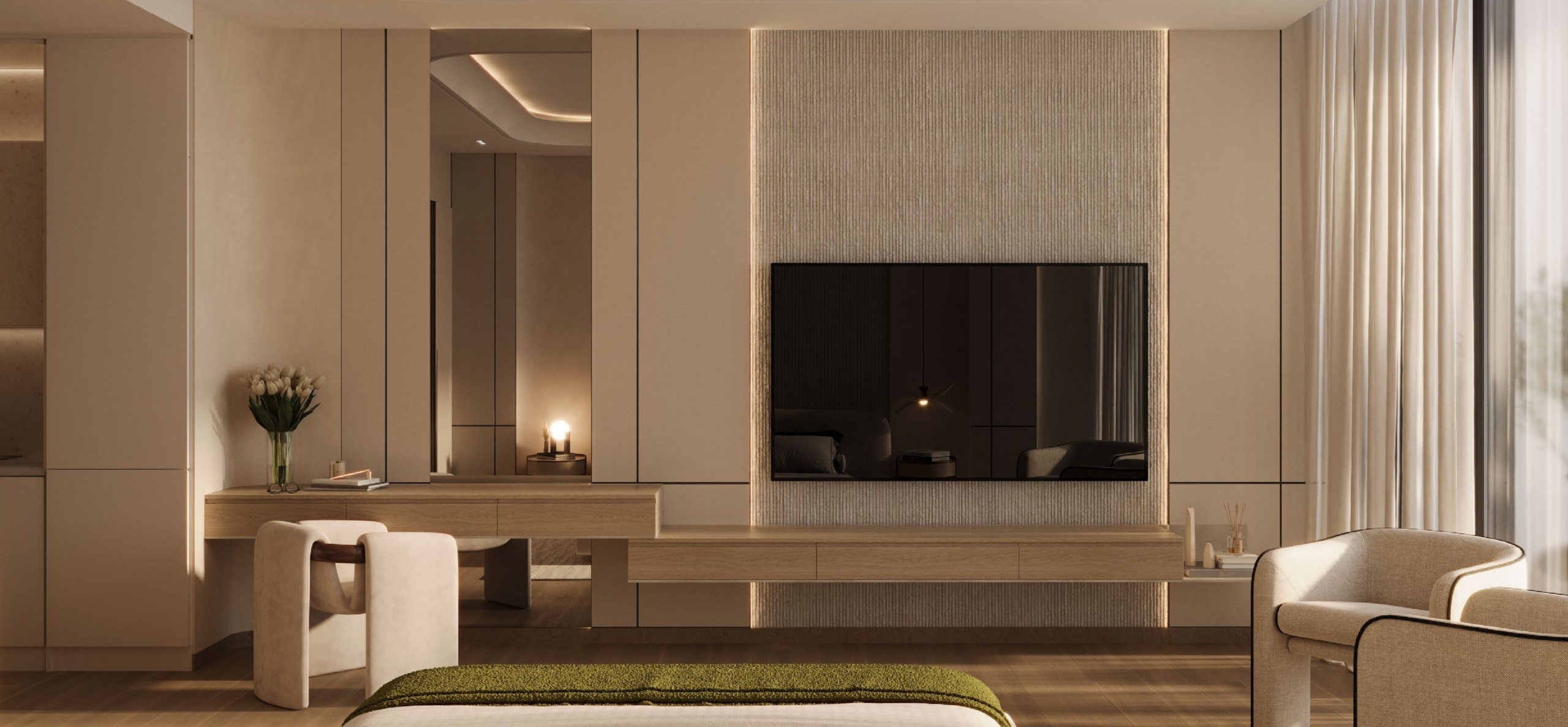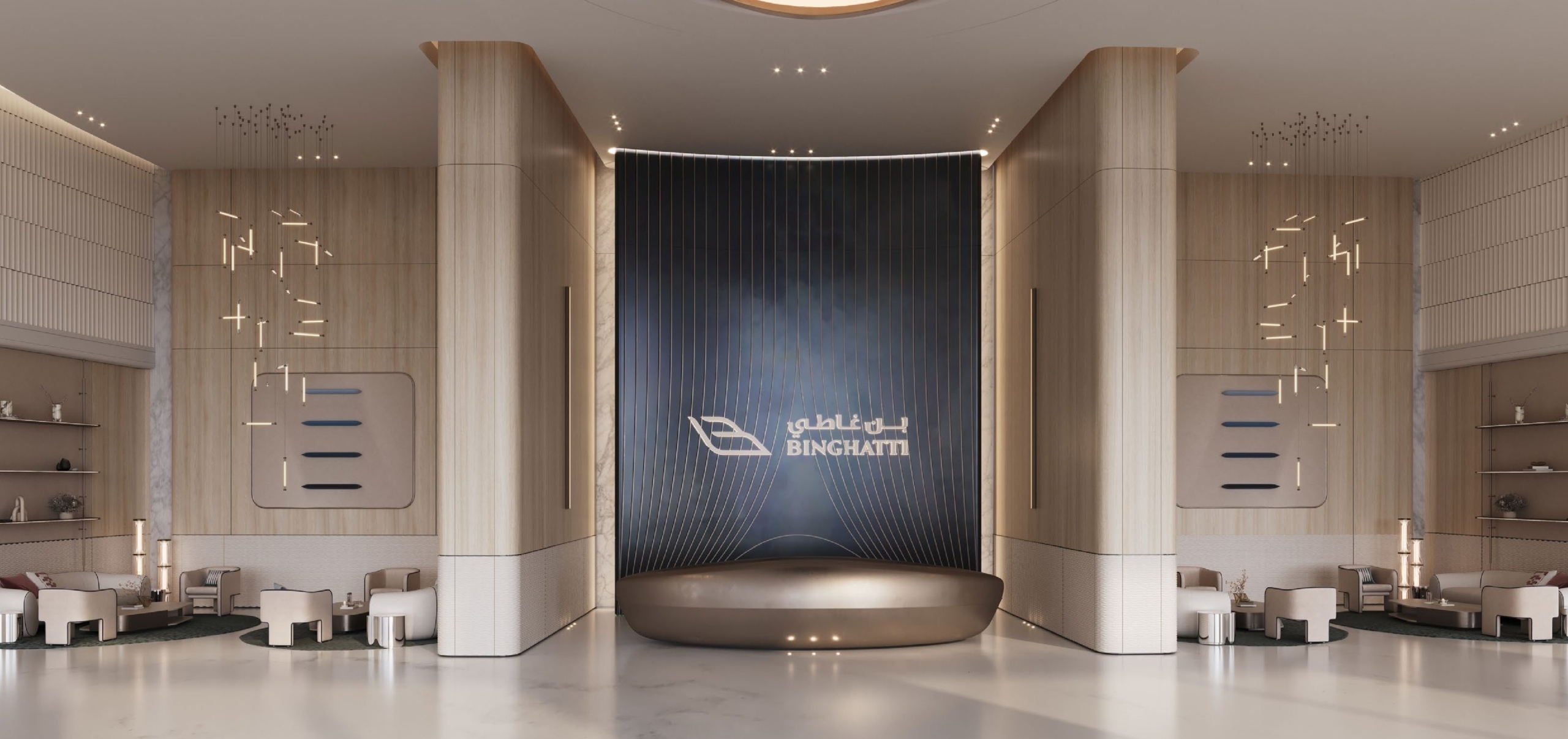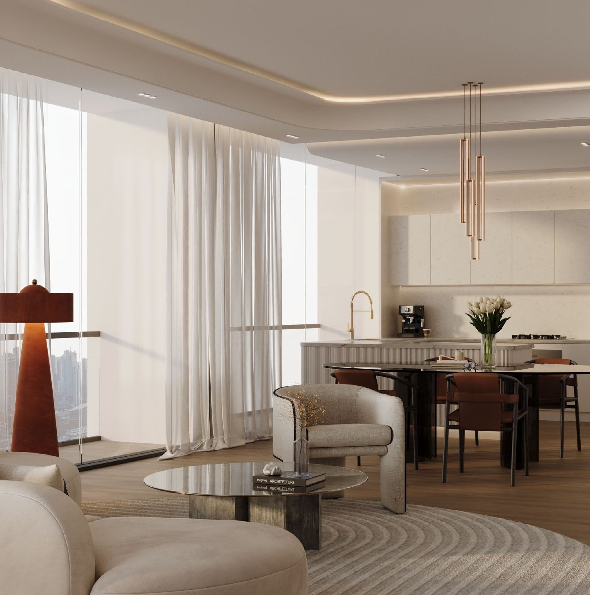 • Masterfully curated interiors featuring exquisite materials like marble, natural wood, and Fluted Travertine.